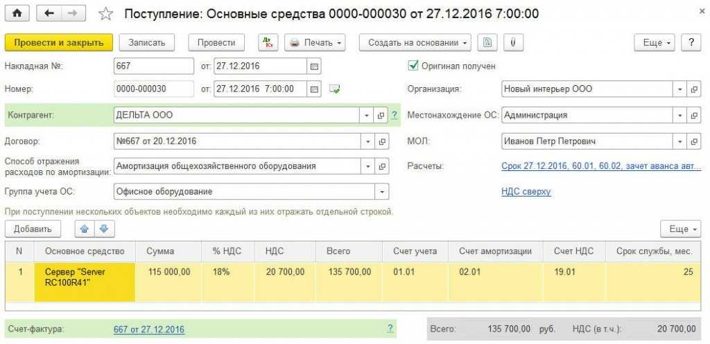 При необходимости пользователь может в любой момент открыть справочник Основные средства, чтобы ввести дополнительную информацию о конкретном объекте. Проводки после проведения документа: