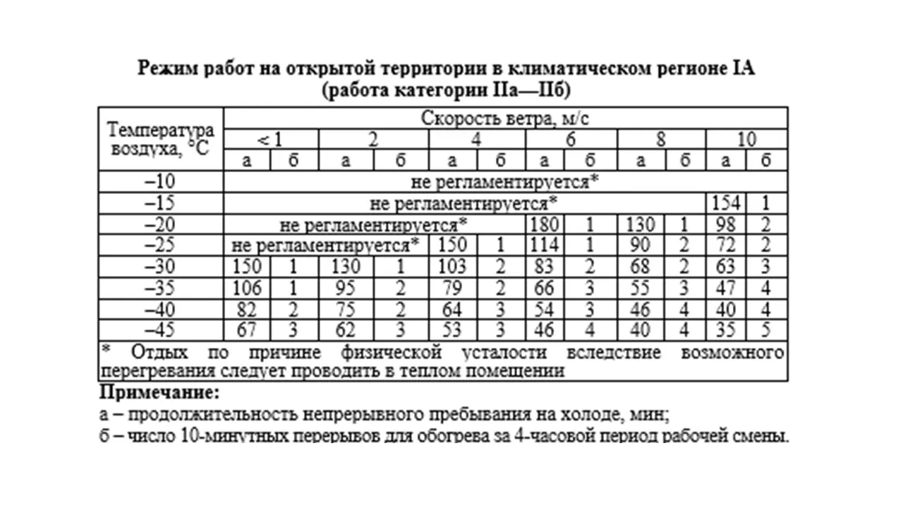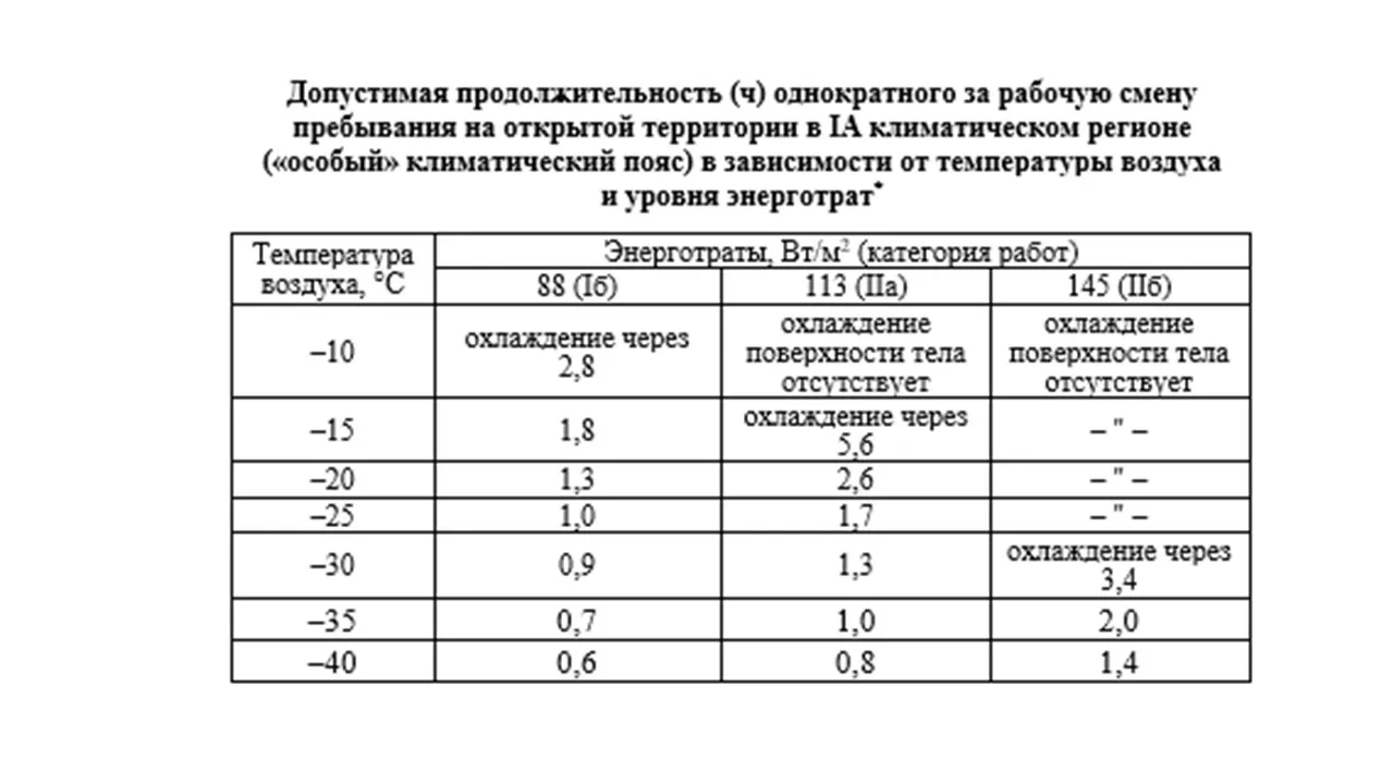 Обязательно, чтобы работник по медицинским показаниям мог выполнять работу на холоде. Всем трудящимся надо выдать спецкостюмы и средства обогрева. Режим работы должен быть выстроен с учетом текущих погодных условий — обязательно должны быть предусмотрены перерывы и места, где можно отогреться. Эти помещения не должны находиться дальше ста метров от места выполнения работ. К тому же есть специальная таблица в методических рекомендациях для климатической зоны, куда относится ЯНАО, в зависимости от вида работ и температуры — сколько в течение рабочей 4-х часовой смены должно быть перерывов. Все перерывы включаются в рабочее время и оплачиваются.