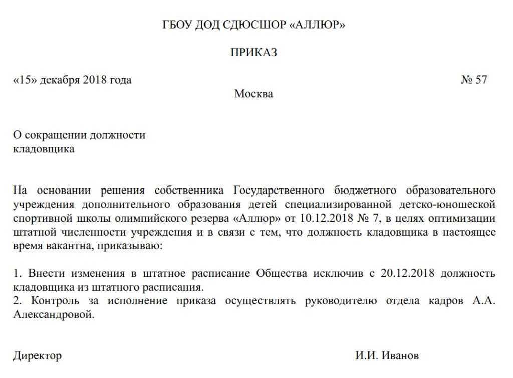 Предупредить о грядущих штатных изменениях в фирме директор обязан в письменном виде, под личную роспись. Иногда сотрудник, получивший неприятное известие, отказывается подписывать уведомление. В таком случае оформляют специальный акт в присутствии двоих свидетелей из работников фирмы — они же потом под ним ставят свои подписи. Если это маленькая фирма, достаточно одного свидетеля.