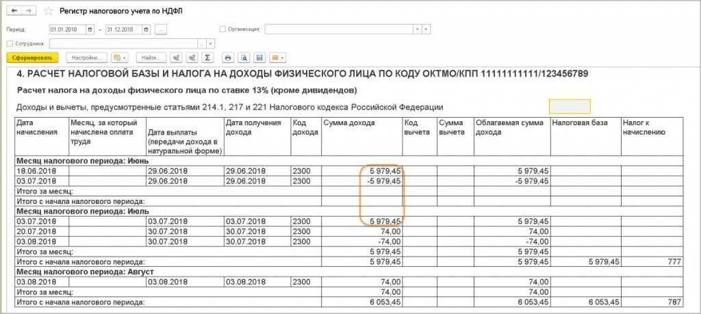 В отчете в налоговых периодах июнь-июль начисленная сумма дохода составляет 5 979,45 руб. и отображается трижды (Пример 1). Первый раз сумма была зарегистрирована в июне. Но перенос даты фактического получения дохода на июль вызывает регистрацию этой суммы еще дважды: с плюсом — в июле и с минусом — в июне. Аналогично сумма доначисления 74 руб. (Пример 2) регистрируется сначала в июле, но затем переносится с июля на август (т. е. дополнительно регистрируется со знаком минус в июле и со знаком плюс — в августе).