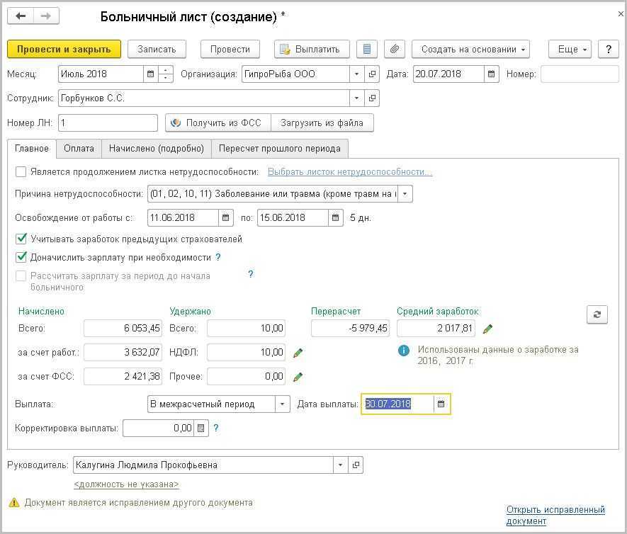 В продолжение Примера 1: в июле 2018 года после получения пособия С.С. Горбунков представил в бухгалтерию справку для расчета пособий о заработке в 2016 году у другого страхователя. Уточнение информации о среднем заработке повлекло необходимость перерасчета пособия. Новый документ Больничный лист № 2 (рис. 1) создан на основании исходного по кнопке Исправить. При перерасчете пособия предполагалось выплатить доначисленную сумму 30.07.2018. Но реально доначисления были выплачены 02.08.2018.