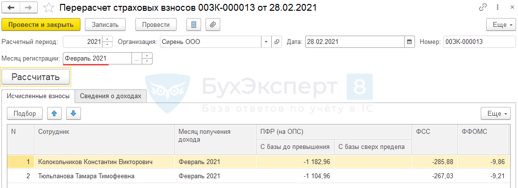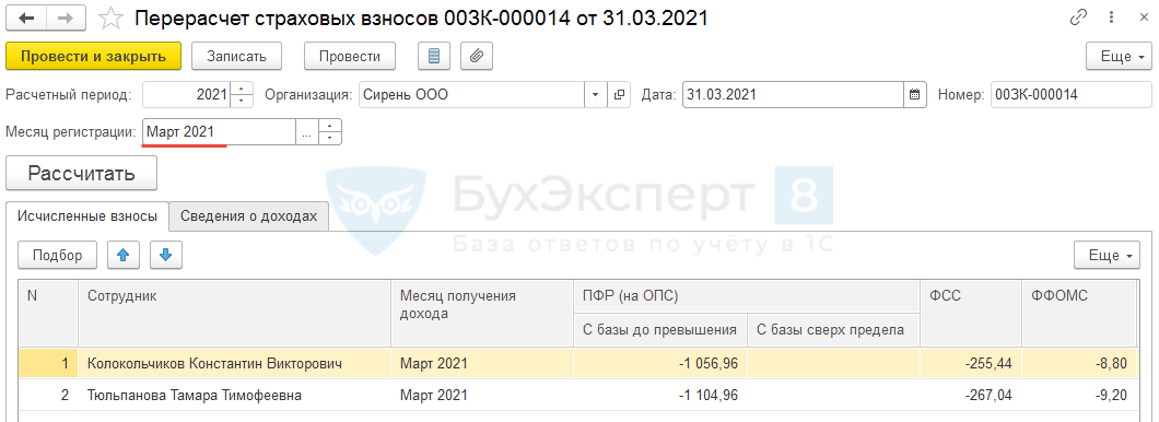 Создадим таким же способом два документа Перерасчет страховых взносов за февраль и март 2021 года.
