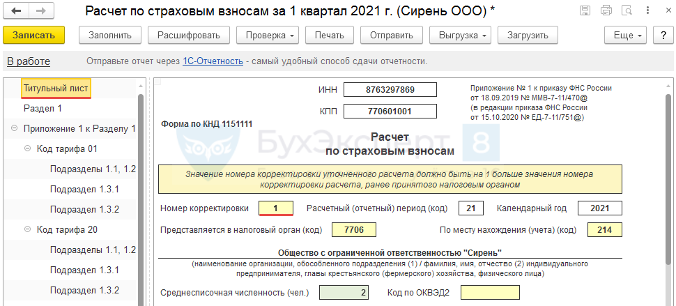 Для этого в РСВ на Титульном листе укажем номер корректировки (в нашем случае 1) и заполним отчет.