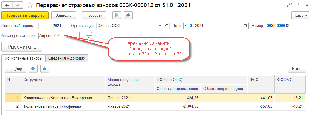 Чтобы проводки по пересчитанным страховым взносам сформировались автоматически в Апреле 2021 года, в трех документах Перерасчет страховых взносов временно изменим Месяца регистрации за 1 квартал 2021 г. на Апрель 2021 года