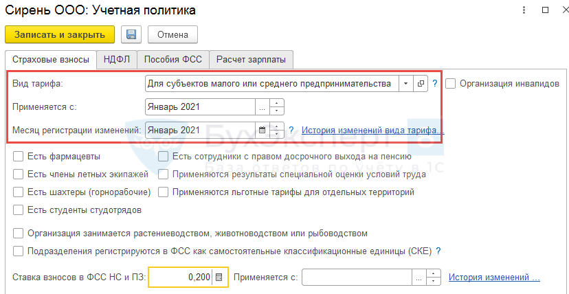 Для перерасчета взносов вначале изменим в Учетной политике организации (карточка Организации – вкладка Учетная политика и другие настройки – Учетная политика ) Вид тарифа страховых взносов с Основного тарифа страховых взносов на тариф Для субъектов малого или среднего предпринимательства . Укажем, что изменения внесены в Январе 2021 года и применяться будут с того же месяца.