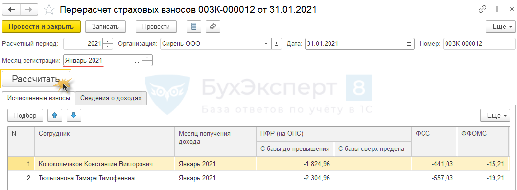 Затем создадим документ Перерасчет страховых взносов ( Налоги и взносы – Перерасчеты страховых взносов ). Укажем в качестве Расчетного периода 2021 год, Месяца регистрации — Январь 2021 года и рассчитаем документ.