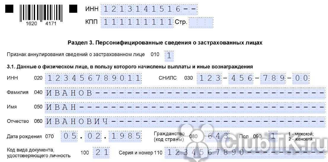 Если в разделе 3 допущена ошибка в любом другом поле (дата рождения, паспортные данные, суммы), то в составе уточненного расчета нужно подать раздел 3 на этого работника с верными данными, указав по строке 010 порядковый номер корректировки.