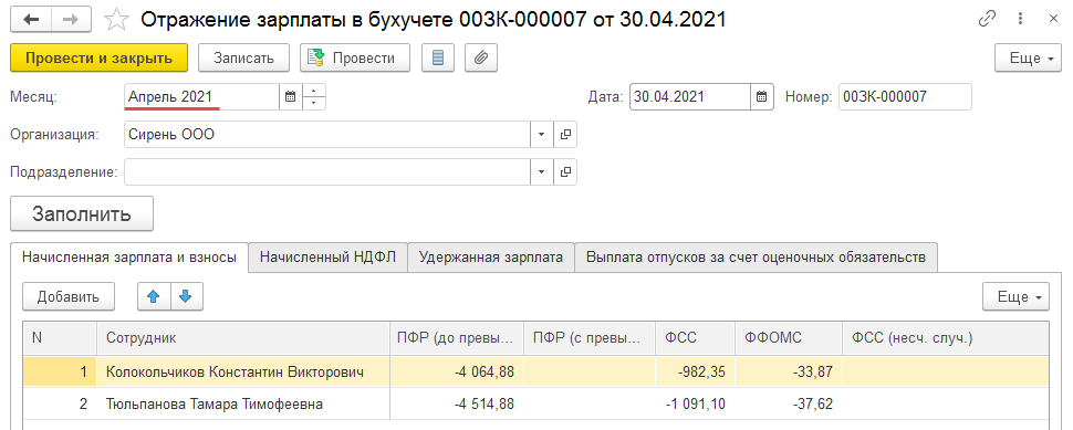 После начисления зарплаты за апрель 2021 года и формирования Отражения зарплаты в бухучете только по данным Апреля 2021 года, вновь проведем апрельский документ Отражения зарплаты в бухучете только с пересчитанными взносами за 1 квартал 2021 года.
