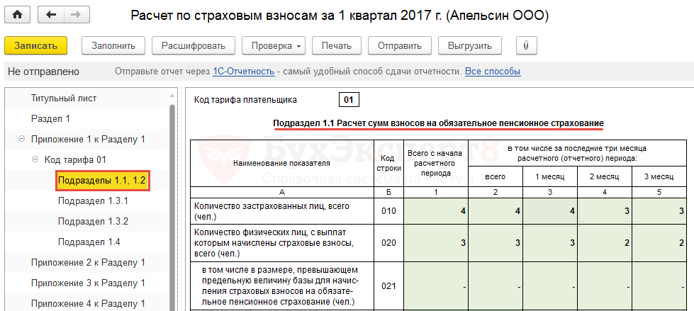 В Подразделе 1.1 приводится расчет сумм страховых взносов на обязательное пенсионное страхование.
