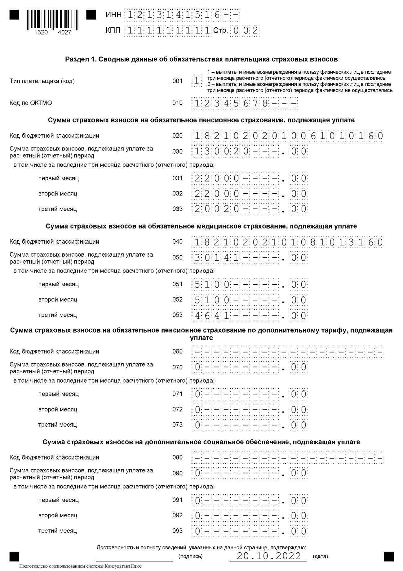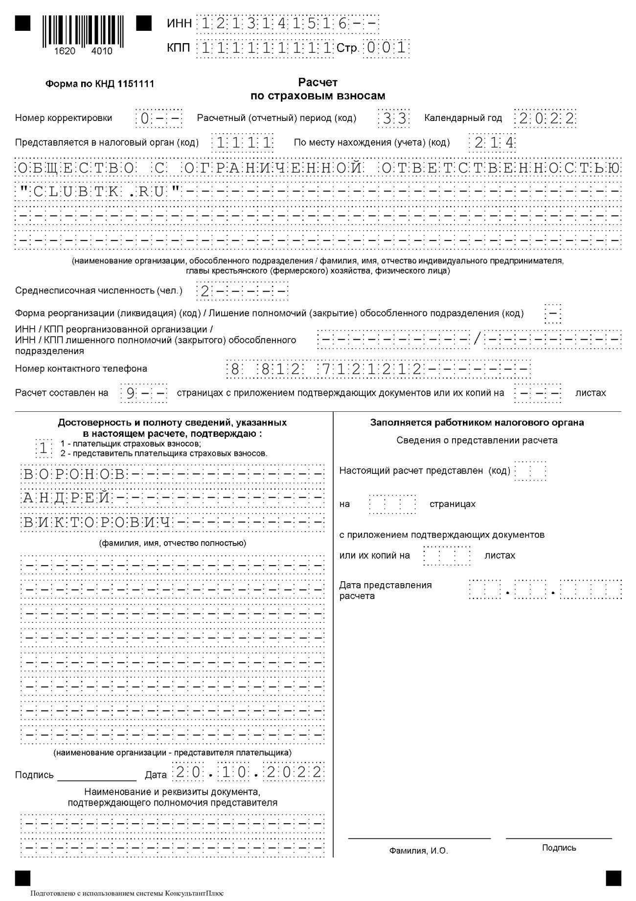 Так выглядит образец расчета по страховым взносам в 2022 году — титульный лист.