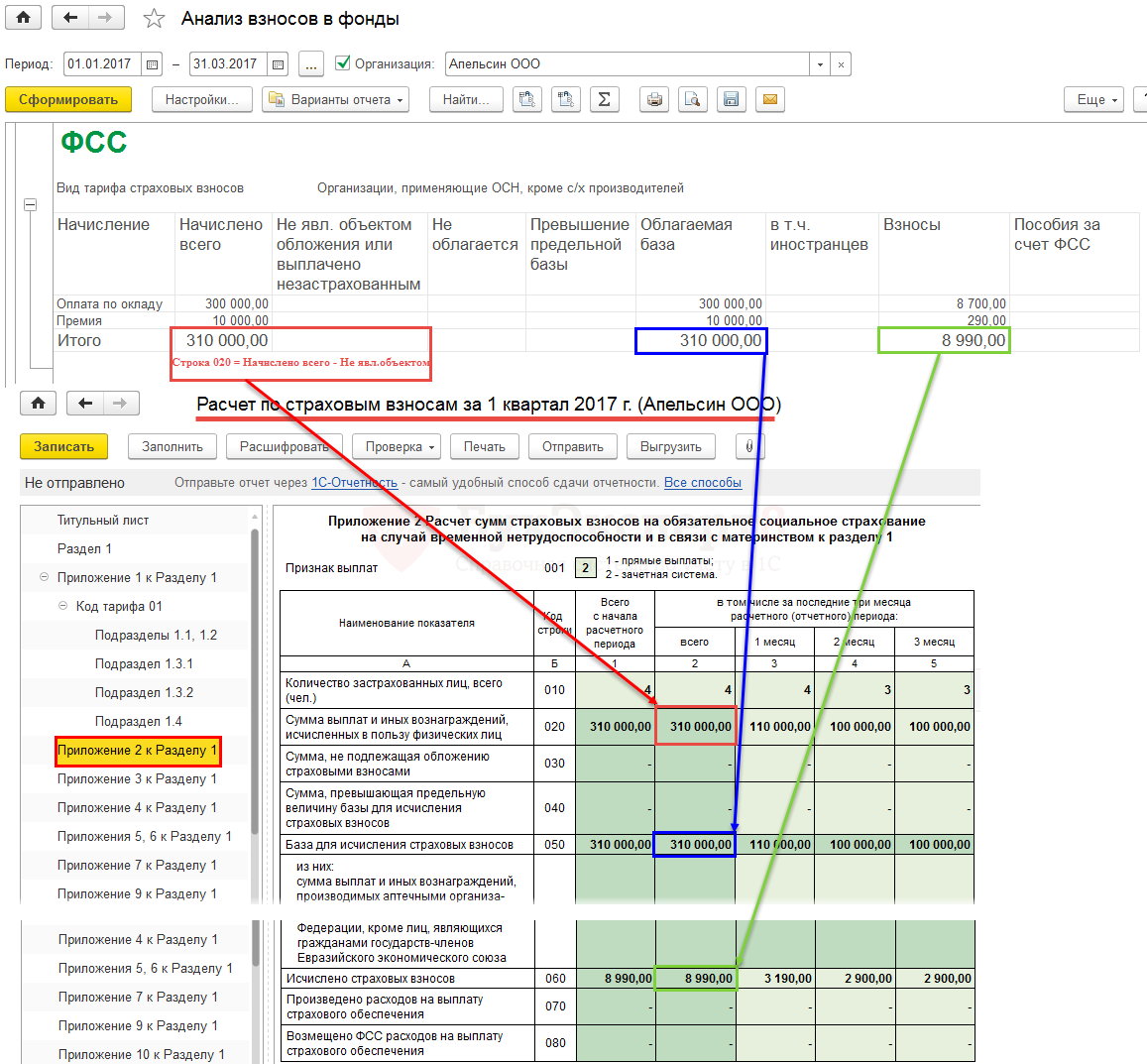 В нашем примере по ОСС количество застрахованных лиц, суммы выплат и база для начисления будут полностью совпадать с данными по ОПС и ОМС.