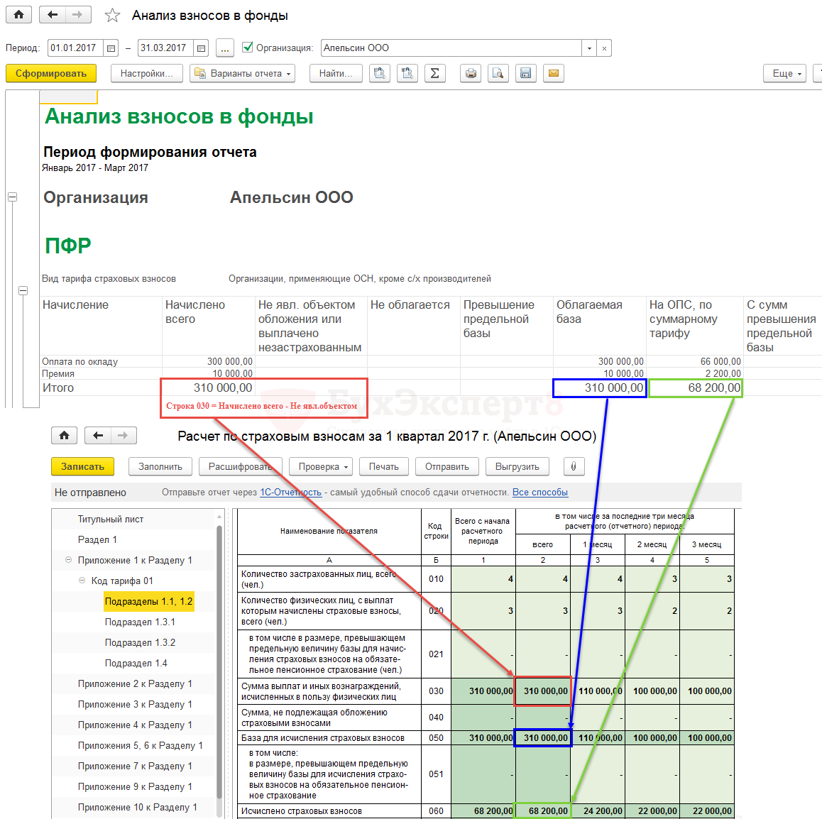 Для проверки информации, попавшей в Расчет по страховым взносам, можно воспользоваться отчетом Анализ взносов в фонды (в Бухгалтерии 3.0 отчет расположен в разделе Зарплата и кадры – Отчеты по зарплате, в 1С:ЗУП 3 – в разделе Налоги и взносы – Отчеты по налогам и взносам):