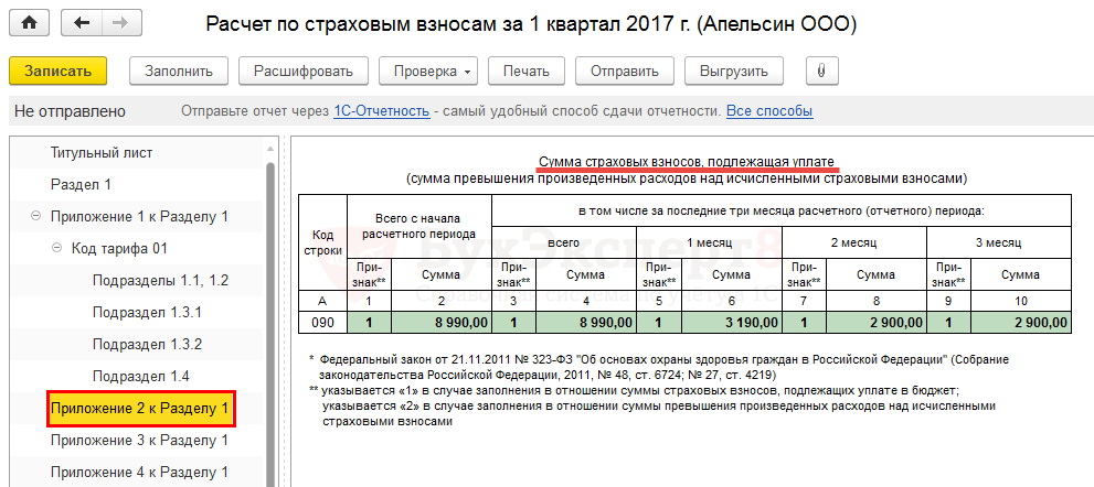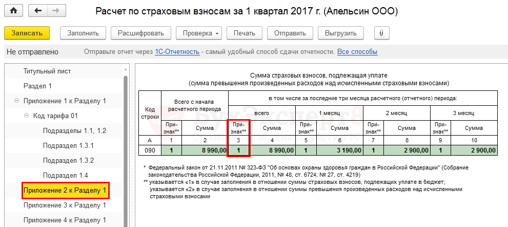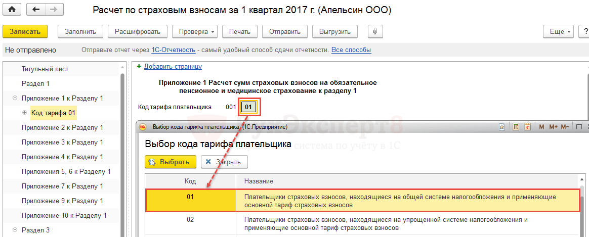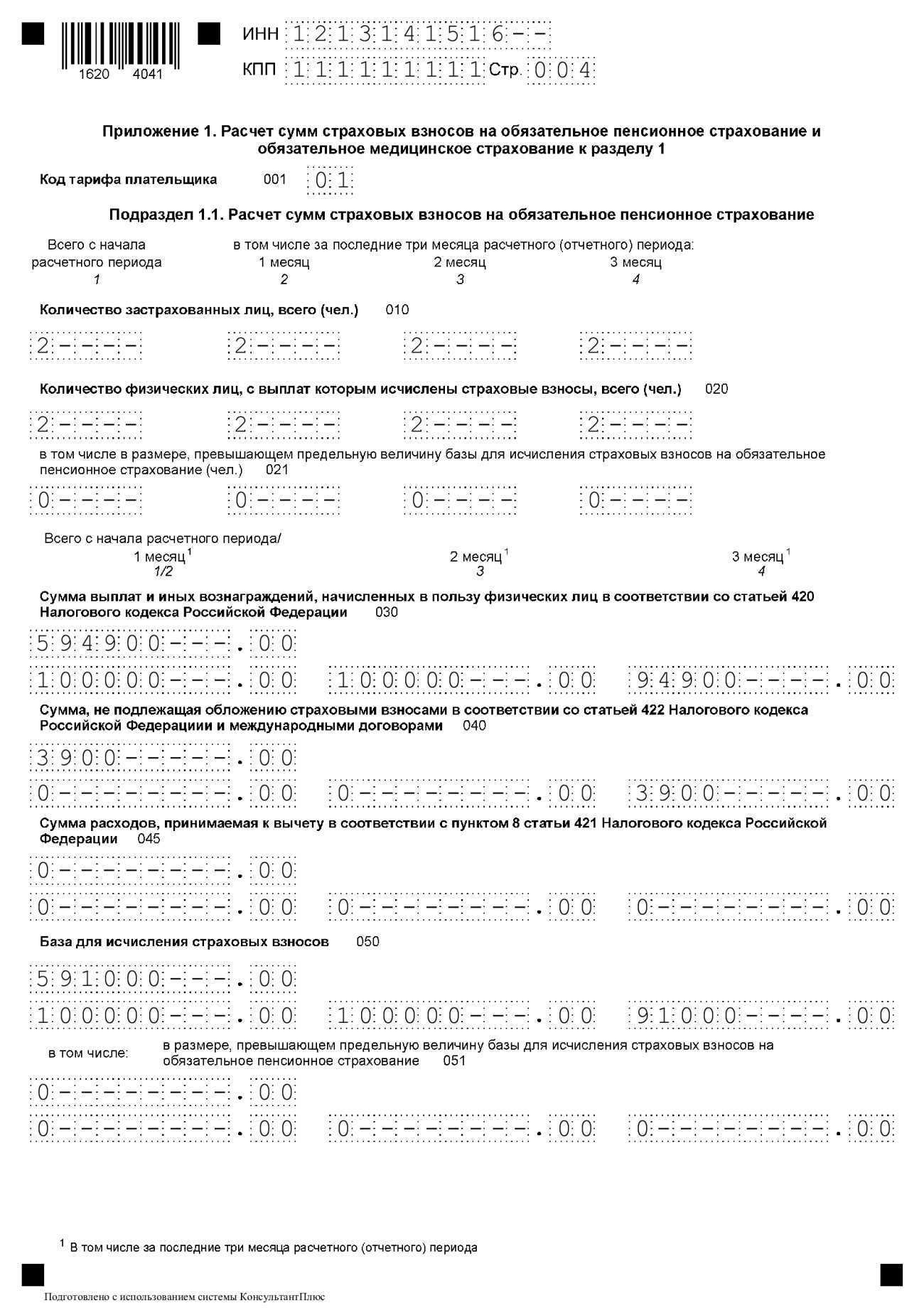 Приложение N 1 к Разделу 1 заполняется в разрезе кодов тарифа плательщика. В нашем примере код тарифа плательщика равен 01, что соответствует основному тарифу и основной системе налогообложения: