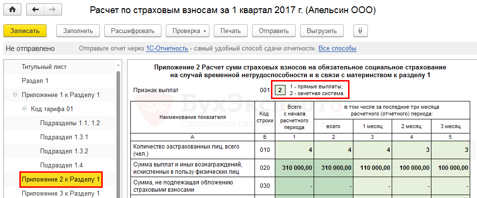 В регионе, в котором ведет свою деятельность ООО «Апельсин», пилотный проект ФСС не действует, поэтому в поле Признак выплат установлено значение 2.