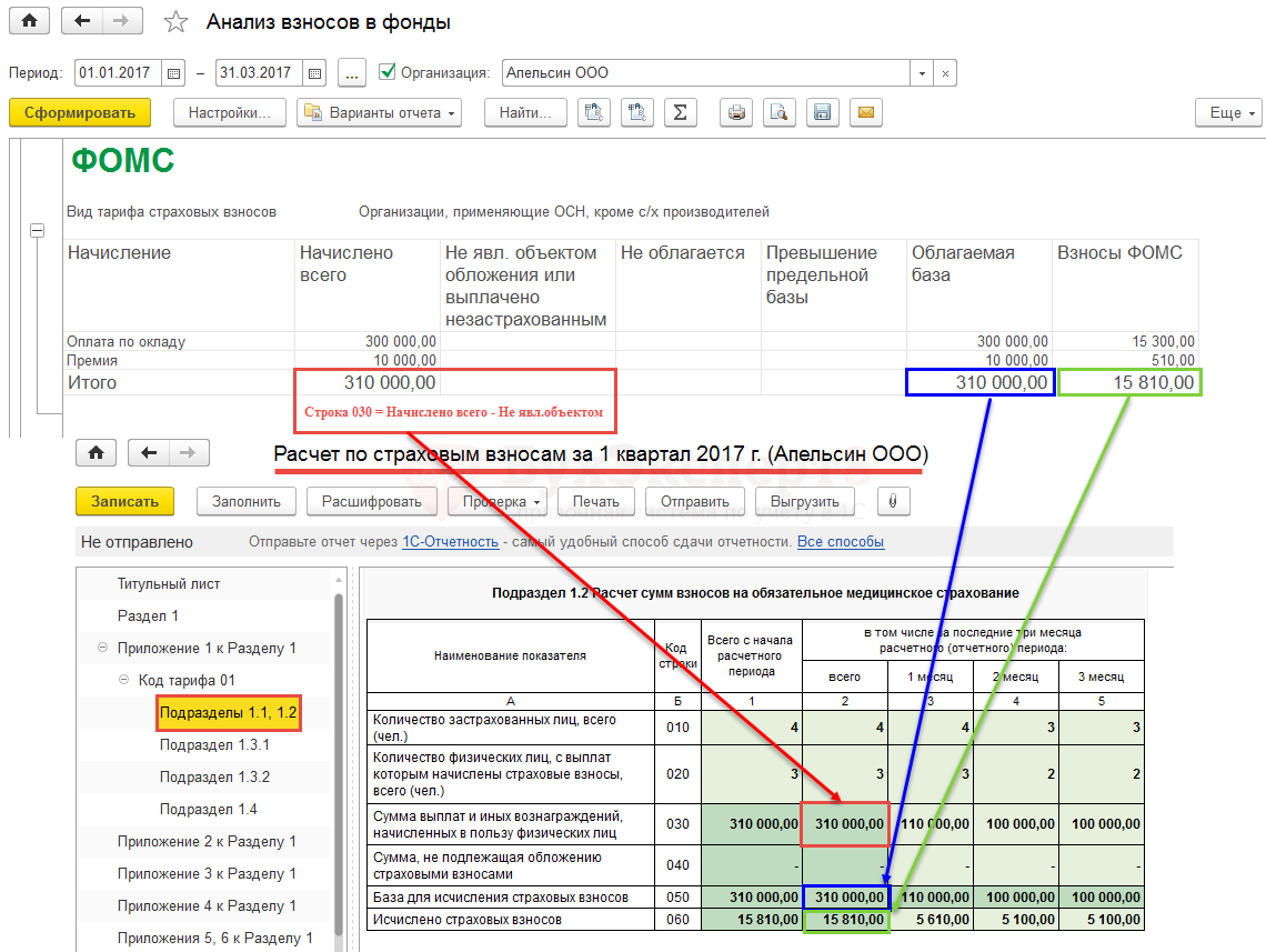 Итоги по разделу 1 подводим в последнюю очередь. В нем отражаем суммы взносов, начисленные к уплате в бюджет.