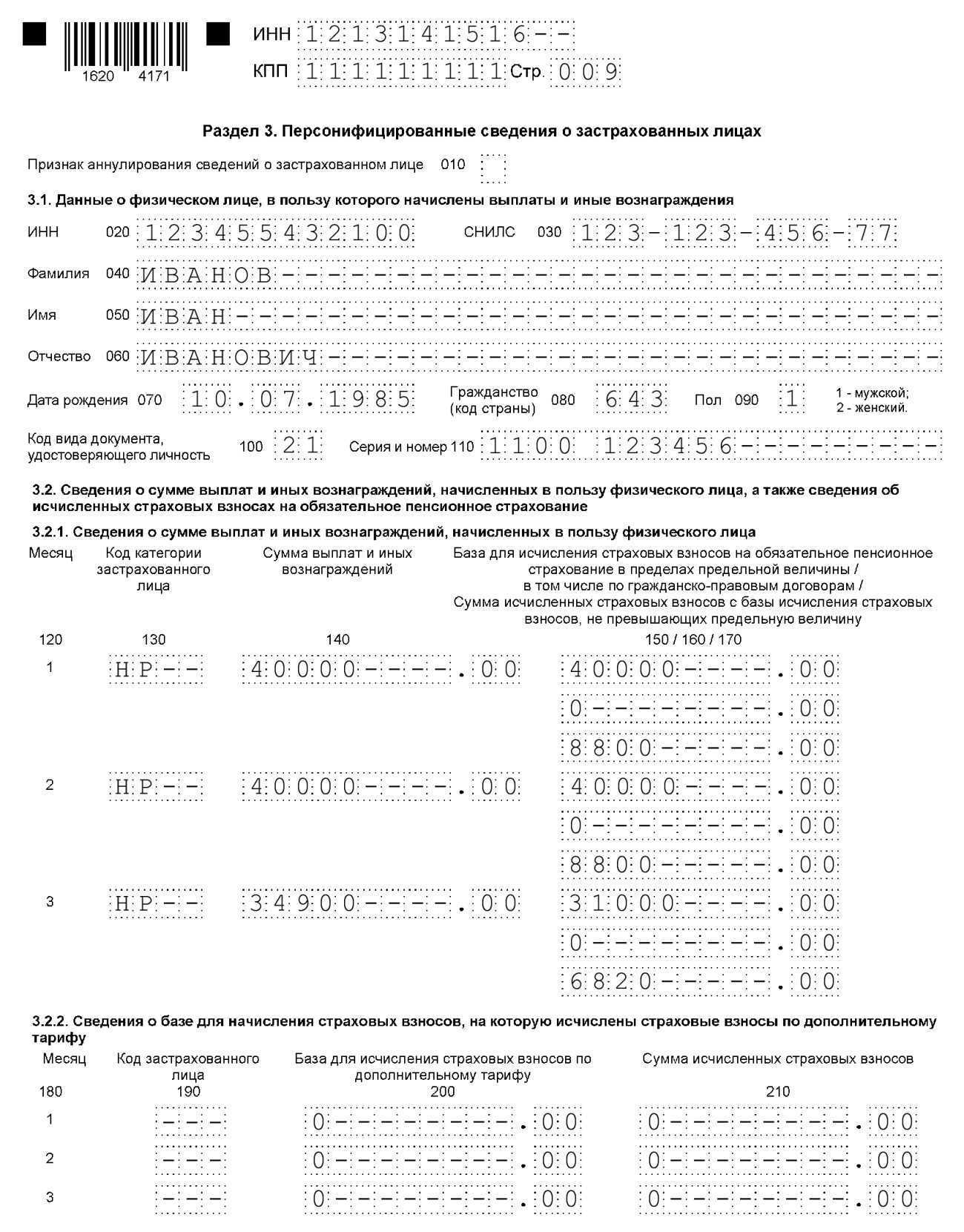 Раздел 3 расчета заполняется плательщиками на всех застрахованных лиц за последние три месяца расчетного (отчетного) периода, в том числе в пользу которых в отчетном периоде начислены выплаты и иные вознаграждения в рамках трудовых отношений и гражданско-правовых договоров, предметом которых является выполнение работ, оказание услуг, по договорам авторского заказа.