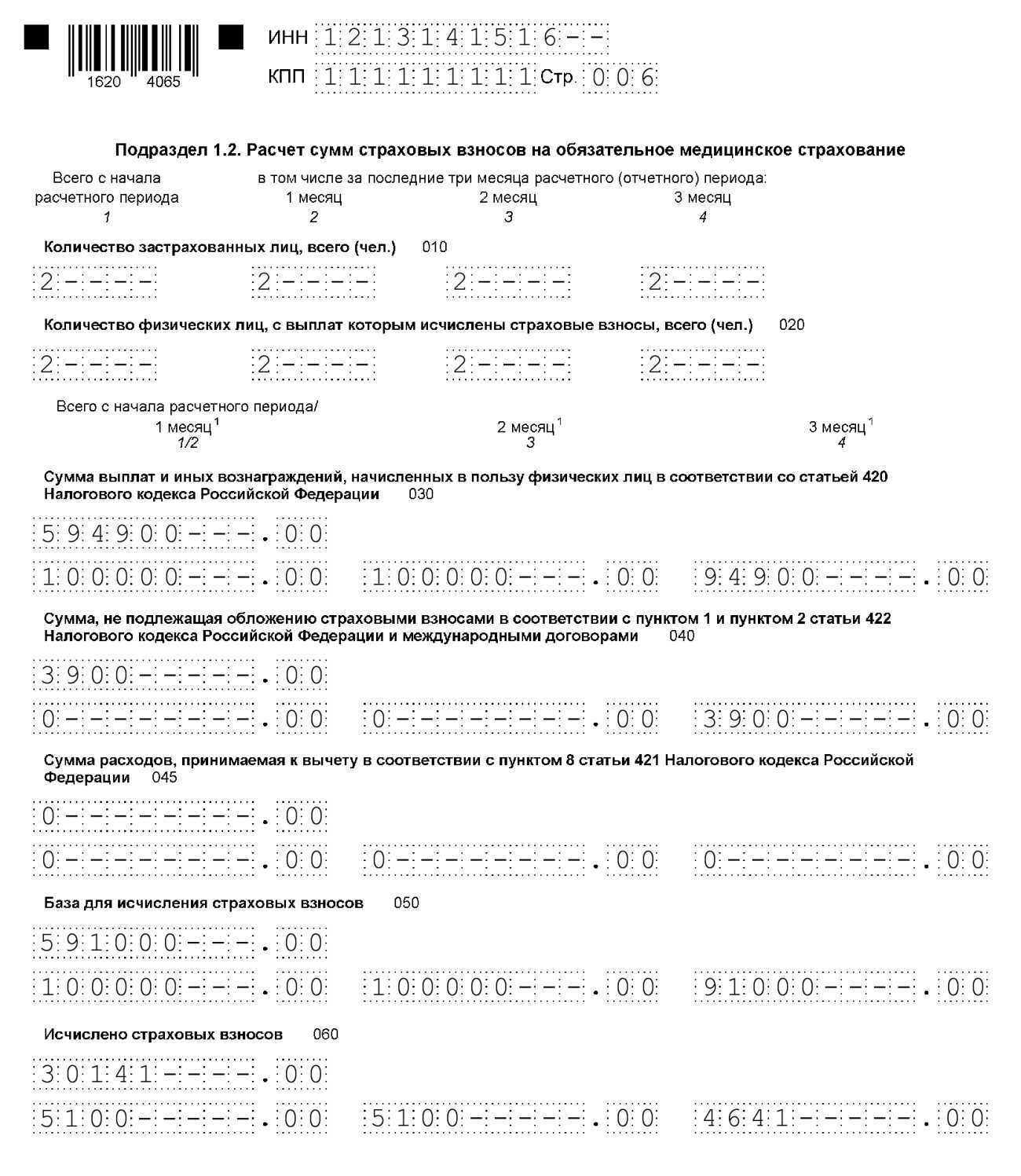 В Подразделе 1.2 приводится расчет сумм страховых взносов на обязательное медицинское страхование.