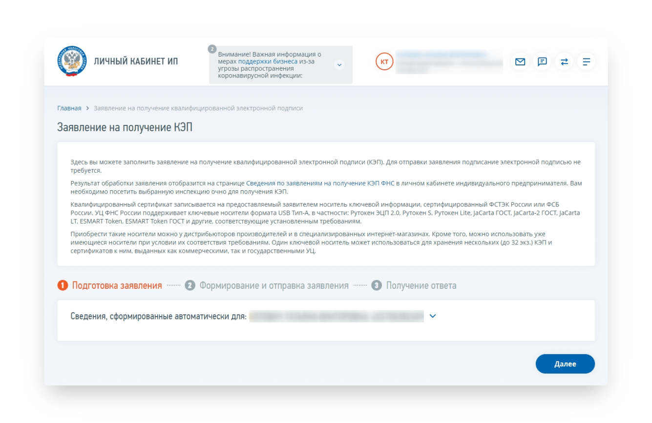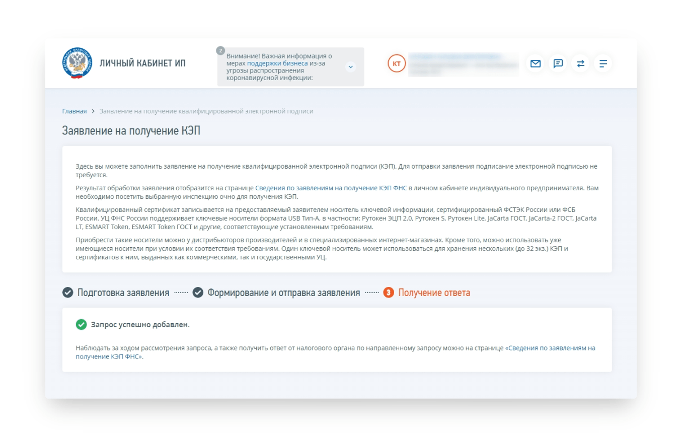 - Зайдя в личный кабинет, индивидуальный предприниматель выбрал услугу «Заявление на получение КЭП».