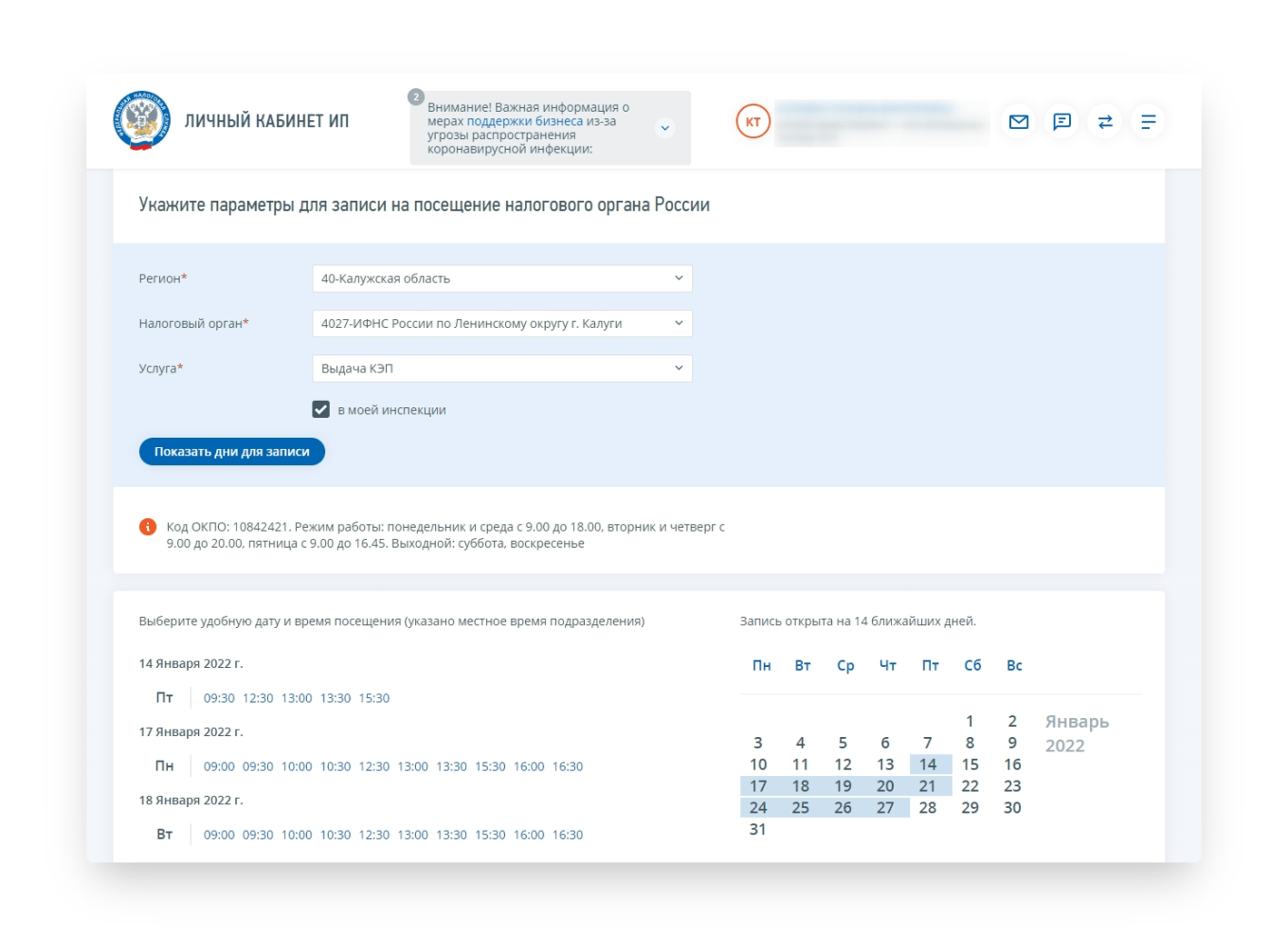 5. После того как индивидуальный предприниматель успешно выбрал дату и время, ему пришёл пин-код — он нужен, чтобы взять талон на месте приёма в терминале ФНС.