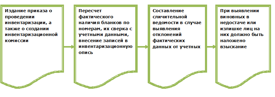 Проверяется отдельно каждый вид бланков, учитывая материально ответственных лиц, места хранения, начальные и последние номера.