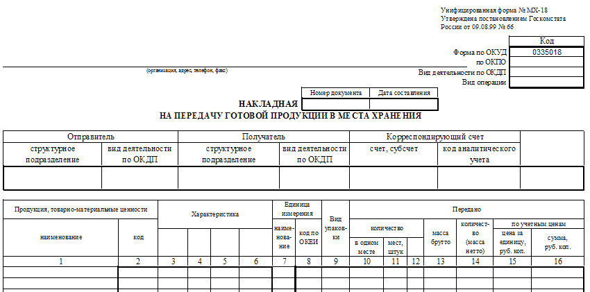 Накладная на передачу готовой продукции в места хранения (форма n мх-18)