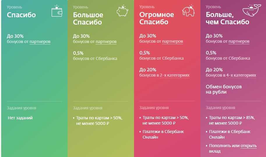 - Уровень 4: «Больше чем Спасибо». Условия очень серьезные — доля безнальных расчетов должна составлять 85%, прибавьте задания за прошлые уровни и еще добавьте открытие/пополнение депозита или оформление кредитки. Если справитесь — привилегии будут максимальными, а накопленные баллы можно менять на реальные деньги.