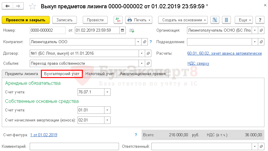После выполнения всех обязательных платежей, лизингополучатель сторнирует сумму с забалансового счета, делая проводку по кредиту 001. Одновременно имущество ставится на балансовый счет лизингополучателя (Дебет 01 Кредит 02 — сумма основного средства за минусом НДС, так как сумма НДС по имуществу принималась к зачету по выставленным счетам-фактурам лизингодателя).