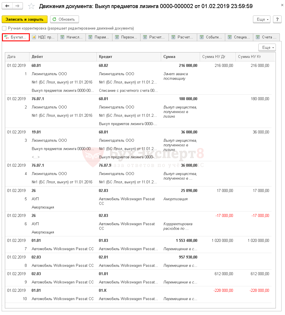 - Дт 02.03 Кт 02.01 — перенесение амортизации, начисленной в периоде лизингового договора;