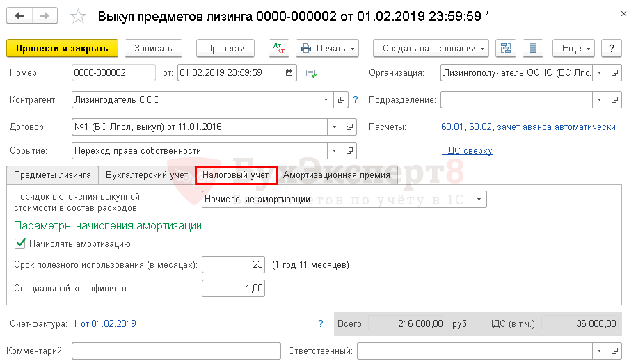 - Порядок включения выкупной стоимости в состав расходов — можно выбрать из 3-х вариантов: Начисление амортизации — если выкупная стоимость ОС не менее 100 тыс. руб.: в нашем примере выбираем этот порядок;