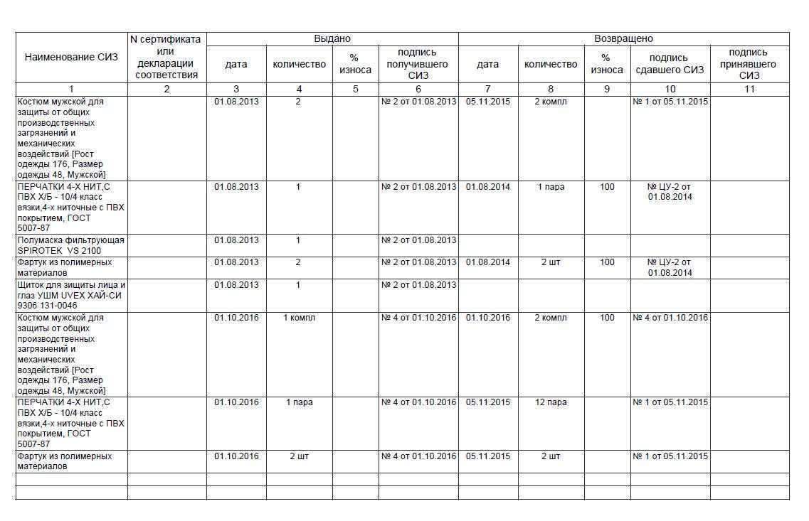 - информация о возврате СИЗ на склад: календарный день, число изделий, степень износа, подписи сдающего и приемщика.