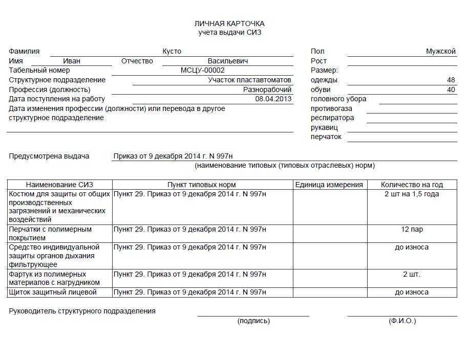 Заполнение личной карточки производится при вступлении работника в должность, которая требует выдачи СИЗ. При изменении структурного подразделения или перечня средств личной защиты соответствующие отметки должны обязательно вноситься в карточку.