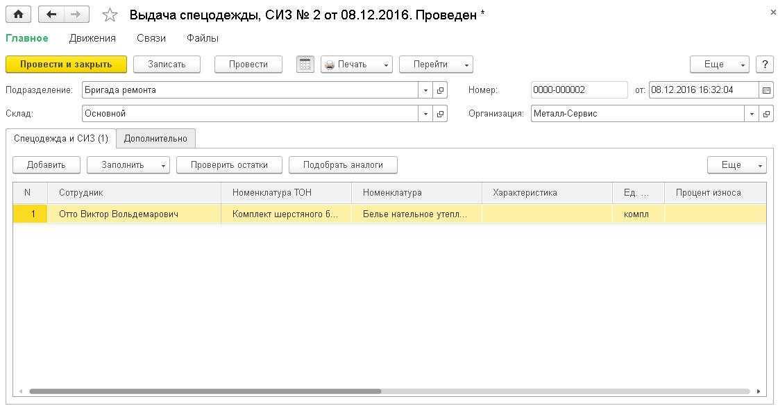 3. Следующим этапом, при условии наличия СИЗ на складах, можно оформить выдачу, для этого заполним документ «Выдача спецодежды, СИЗ», который отражает факт выдачи спецодежды и СИЗ в эксплуатацию сотруднику, подразделению, рабочему месту. Табличная часть «Спецодежда и СИЗ» может быть заполнена автоматически (при помощи команд меню кнопки «Заполнить» над табличной частью документа) по потребностям для физ. лица, для сотрудника, для сотрудников в подразделении.