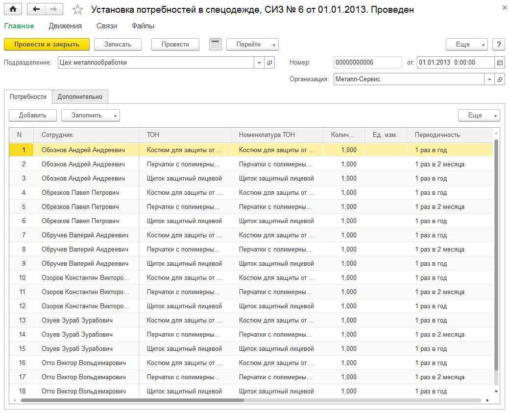 2. Далее необходимо заполнить документ «Установка потребностей в спецодежде, СИЗ». Данный документ помогает нам автоматически сформировать список сотрудников и список необходимой спецодежды, в соответствии с ранее установленными нормами. Кнопка «Заполнить» — «Заполнить по всем нормам» позволяет быстро и удобно заполнить табличную часть сотрудниками.