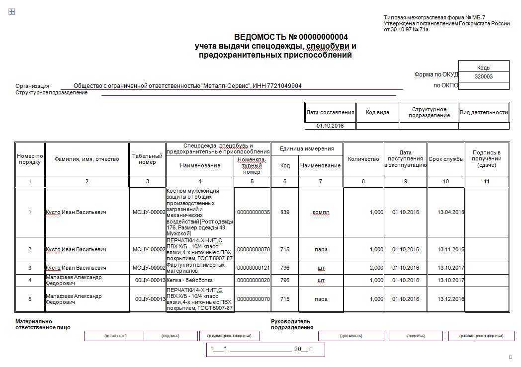 После заполнения документа с легкостью можно распечатать «Ведомость учета выдачи спецодежды МБ-7», номер и дата которой будут отражаться в электронной личной карточке выдачи СИЗ, в графе «подпись получившего», сотруднику остается только расписаться в ведомости учета спецодежды.