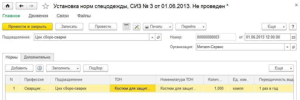 1. На первом этапе необходимо заполнить документ «Установка норм спецодежды, СИЗ», который помогает нам зарегистрировать факт установки норм выдачи спецодежды, СИЗ. В программе предусмотрена возможность установки норм на подразделения, на профессии, на отдельные рабочие места, на конкретных сотрудников, на вредные факторы и на вредные вещества.При выборе профессии и пункта ТОН программа сама проставит периодичность и необходимое кол-во для выдачи, а также укажет срок носки и состояние «Назначить».