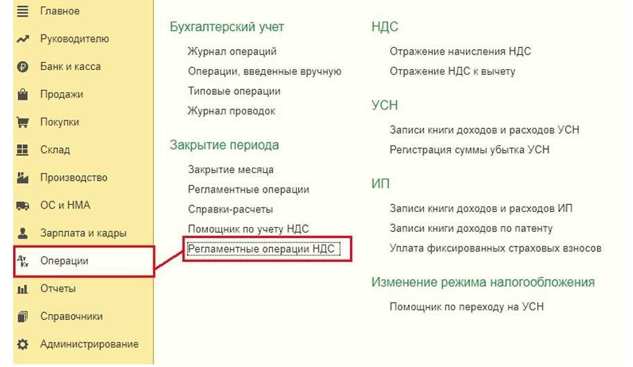 Продвижение по меню: Операции => Регламентные операции НДС.