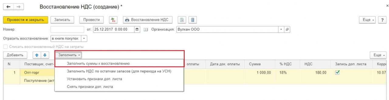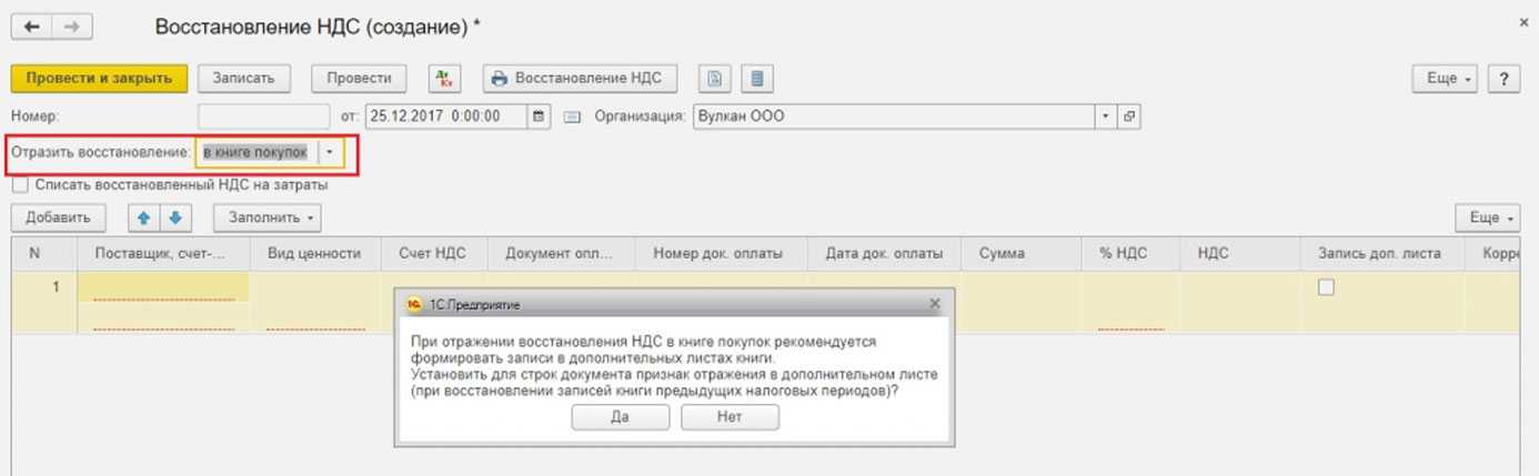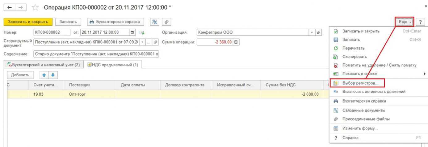 Разработаны разные методики заполнения регистра «НДС Покупки». Предлагается задействовать кнопку «Еще», тогда можно будет этот регистр добавить в документ. Это сторно Поступление. Заполняется вручную.