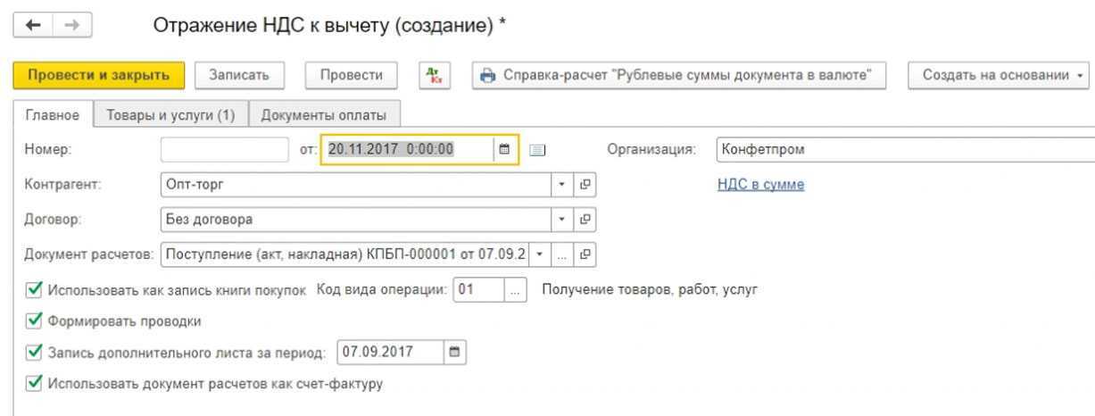 Продвижение по меню: Операции => Отражение НДС к вычету.