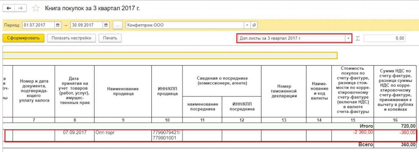 В настройках данного документа должно указываться, что формируются доп. листы, записи книги покупок.