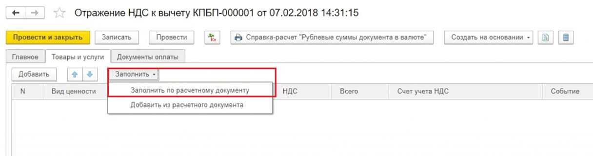 Используется вкладка «Товары и услуги». Выбирается кнопка «Заполнить» с вариантом «Заполнить по расчетному документу».
