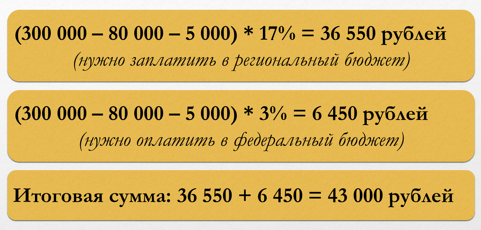 Но считать придётся отдельно для налога, зачисляемого в региональный и федеральный бюджеты. Например, ваш годовой доход — 5 миллионов. Расходы составили 3,5 миллиона. Значит, вам придётся отдать 17% от 1,5 миллионов в казну субъекта и 3% — в федеральную.