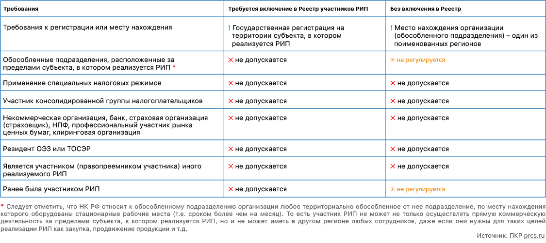 В соответствии с НК РФ, участником РИП может быть признана организация, соответствующая одному из двух перечней требований: