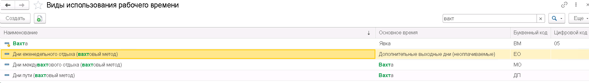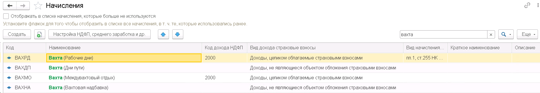 Рекомендуем в названия всех видов рабочего времени для вахты (Настройка — Виды рабочего времени) и в названия начислений (Настройка – Начисления) добавить какие-то объединяющие их слова. Это поможет по фильтру вахт отобрать только эти объекты быстро что-то в них изменить.
