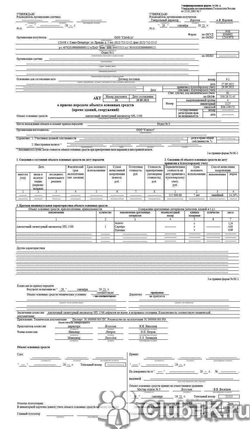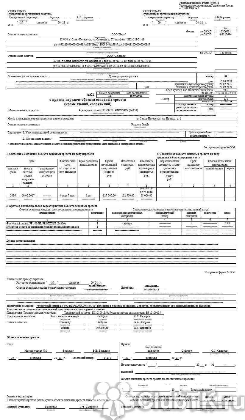 А вот так выглядит образец заполнения формы ОС-1 с примером продажи объекта: