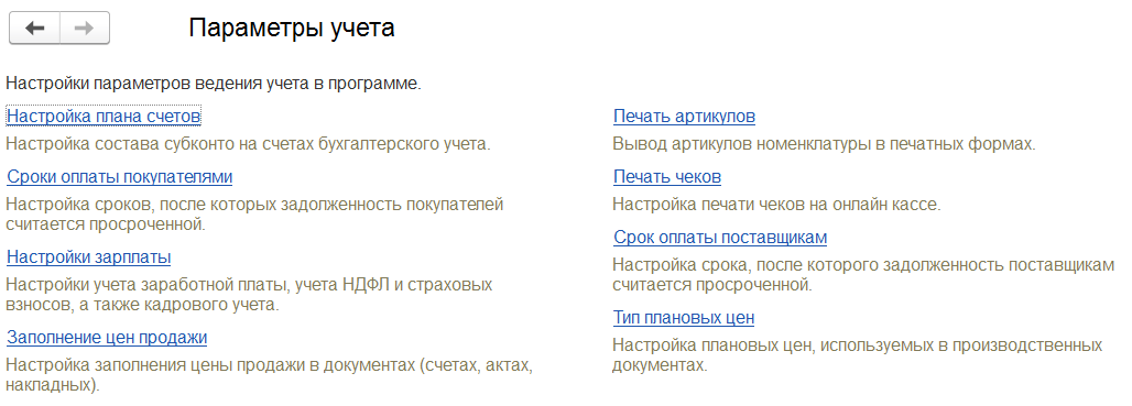 Перед началом ведения учета в программе необходимо настроить параметры учета, завести учетную политику на каждую организацию, а также выбрать систему налогообложения и указать соответствующие опции по налогам. Сделать это можно в разделе «Главное». Все это напрямую влияет, каким образом будут сформированы движения по закрытию периода. Исходя из этого программа определит состав регламентных операций.