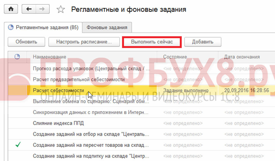 На вкладке Регламентные задания выбрать пункт Расчет себестоимости, выделить его и нажать на кнопку Выполнить сейчас: