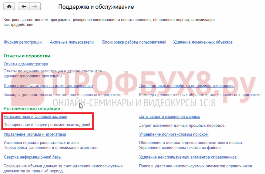 Попасть в список регламентных заданий можно в разделе Администрирование – Поддержка и обслуживание: