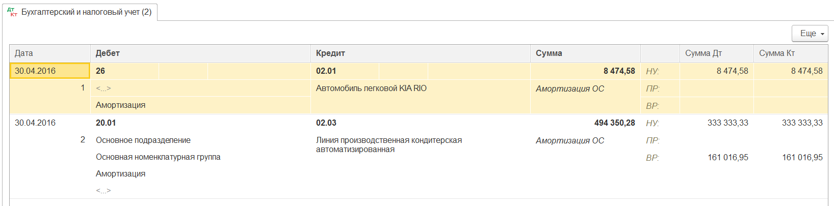 «Амортизация основных средств» — происходит формирование регламентного документа начисления и списания амортизации: