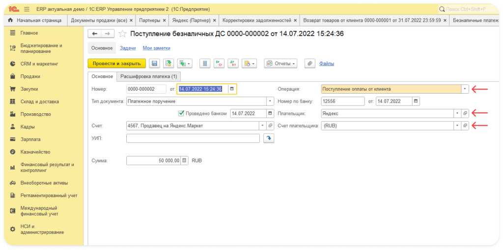 Чтобы отразить поступление денег на расчетный счет по договору на размещение, используйте документ Поступление безналичных ДС. Выберите операцию Поступление оплаты от клиента и плательщика — Яндекс: