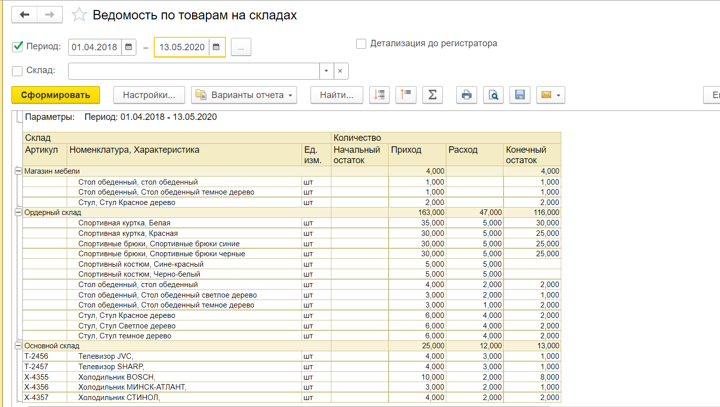 Отчет «Ведомость по товарам на складах» позволяет оценить движение номенклатуры в количественном выражении. Данные можно получить как по компании в целом, так и по конкретному складу. Пользователи могут задать любой временной промежуток.